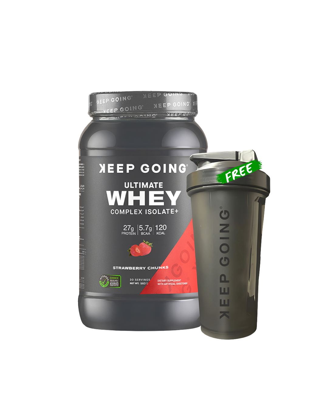 Treat yourself to the refreshing taste of real strawberries with KEEP GOING Ultimate Whey Complex Isolate+ Strawberry Chunks flavor. Each serving delivers 27g of high-quality protein to support muscle recovery and growth, all with just 120 calories per scoop. Perfect for those who want a fruity twist while fueling their fitness goals.