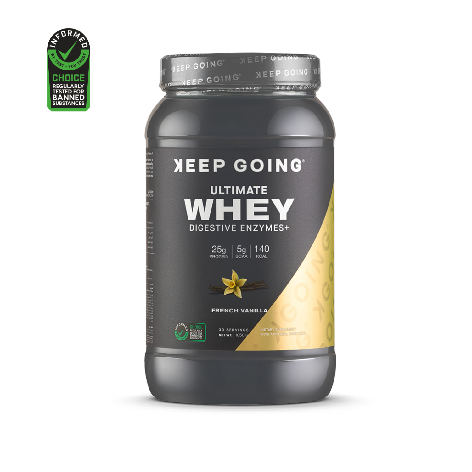 استمتع بالطعم الكريمي الناعم لكيب جوينج التيميت واي دايجستيف انزايمز+ بالفانيلا الفرنسية. كل سكوب بيقدملك 25 جرام من البروتين سريع الامتصاصلدعم تعافي العضلات ونموها، وكل ده في 140 سعرة حرارية بس لكل حصة.