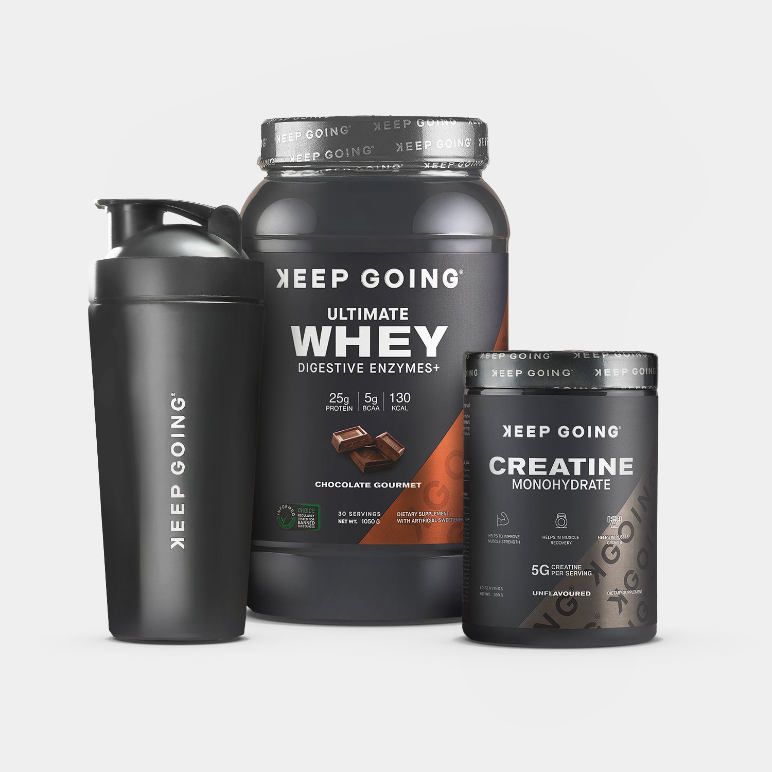 Chocolate Gourmet Whey + Keep Going Creatine Monohydrate + Premium Stainless Steel Shaker