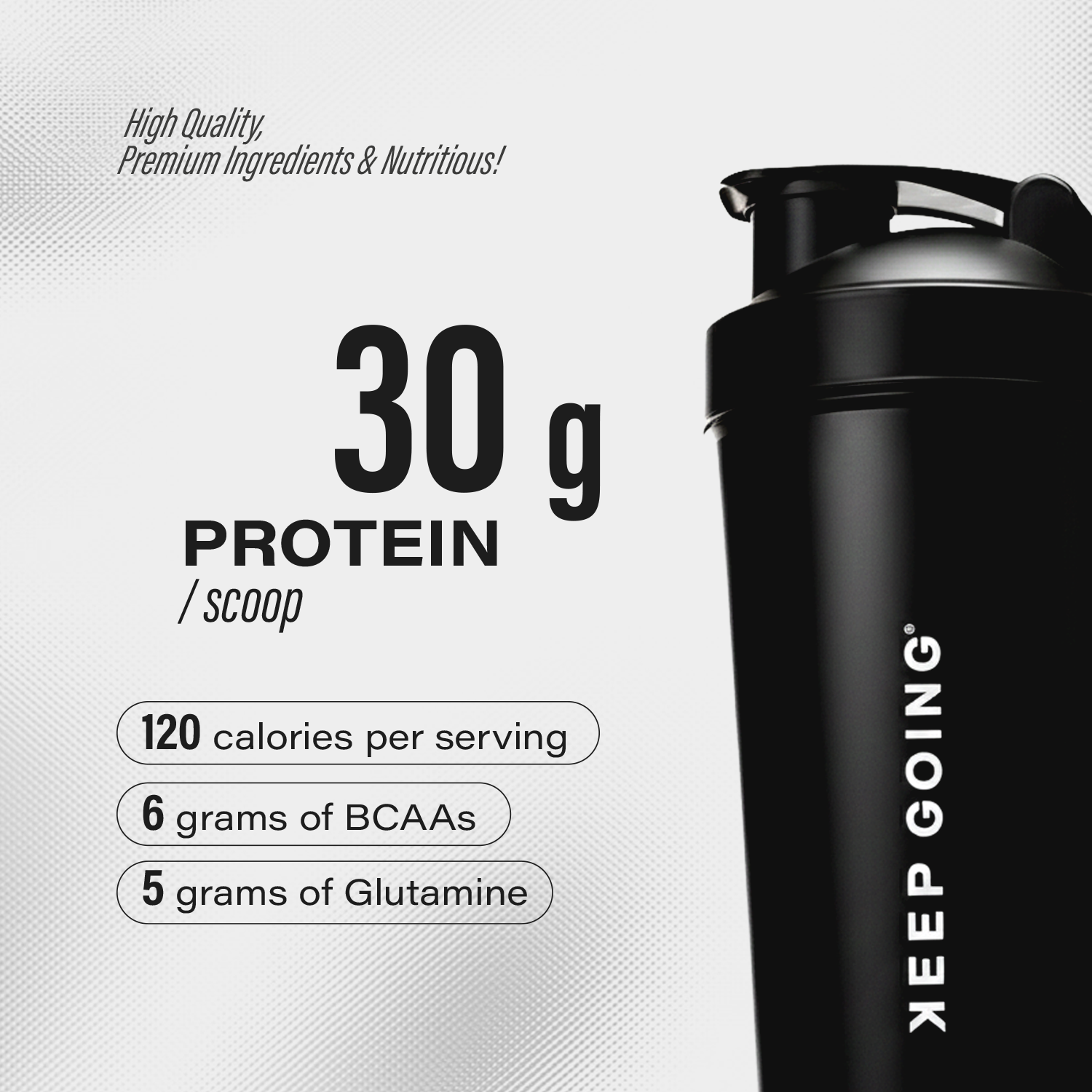 (Per Serving): ● Energy: 120 kcal ● Protein: 30g ● BCAAs: 6g ● Glutamine: 5g